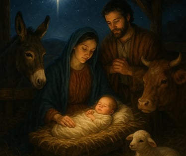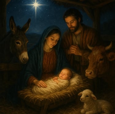 Around them, a donkey, a cow, and a little lamb rest quietly, making the scene warm and calm. It is a moment of joy, hope, and light.